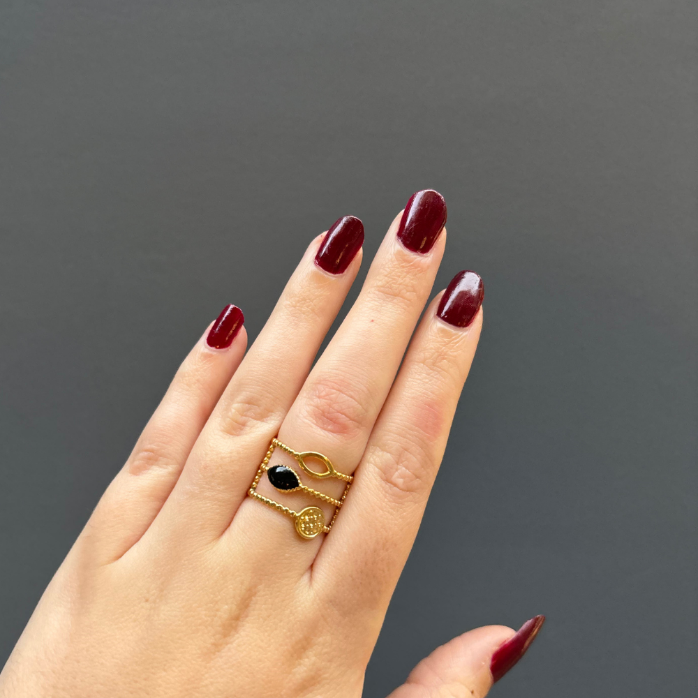Son design triple rang en acier inoxydable doré met en valeur une résine noire en forme de goutte, créant un contraste saisissant et harmonieux.