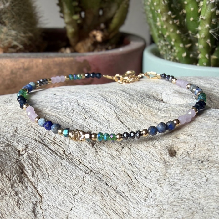 Le bracelet est ajustable grâce aux cordons coulissants et se glisse facilement autour du poignet. Ses finitions délicates grâce aux perles en Argent 925 plaquées Or et aux perles de cristal soulignent les nuances des couleurs du bracelet.