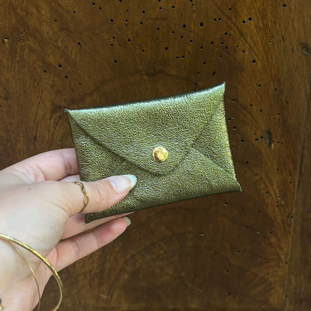 Cette petite pochette en cuir pailleté est élégante et pratique. Idéale comme porte-cartes ou mini porte-monnaie, elle vous accompagne partout grâce à son format compact.