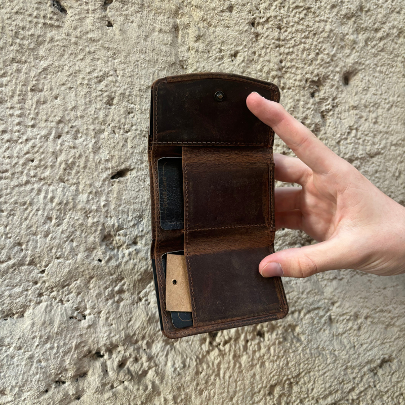 Le porte-monnaie dispose d’un soufflet extérieur fermé par une pression, idéal pour stocker rapidement vos pièces ou petits objets sans risque de perte.